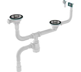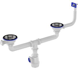 Расстояние между сливами регулируется при установке, может быть от 21 до 47 см. Два выпуска 3 1/2" - разборные, с металлическими решетками 115 мм и ситечком 78 мм. Один выпуск в комплекте с трубкой и прямоугольным переливом с двумя видами прокладок, под прямую и круглую мойки. Второй - с...