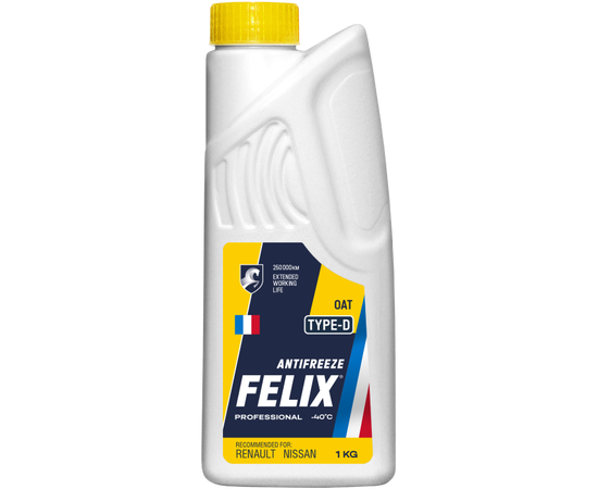 Антифриз FELIX® Type-D представляет собой смесевую композицию на основе водного раствора этиленгликоля, воды и карбоксилатного пакета стабилизирующих и антикоррозионных присадок, содержащих противопенные и красящие добавки. Рекомендован к заливке в автомобили RENAULT, NISSAN.