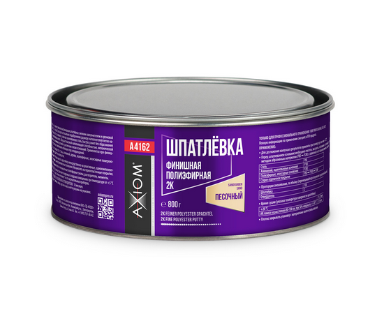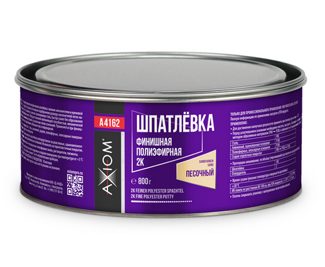 Полиэфирная двухкомпонентная финишная шпатлёвка с мелким наполнителем и кремовой структурой состава. Шпатлевка AXIOM® A4162 благодаря оптимально подобранному размеру наполнителей легко наносится на любые основания, включая оцинкованную сталь, быстро сохнет без образования пор, легко обрабатывается. Обладает высокой наполняющей способностью, механической прочностью, отличной адгезией к различным типам оснований. Применяется при финишной отделке и для заполнения небольших пор и повреждений.
