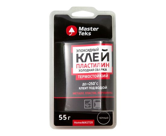 Клей-пластилин эпоксидный MasterTeks HomeMASTER холодная сварка ТЕРМОСТОЙКИЙ 0,55, черный. Предназначен для склеивания,ремонта,герметизации соединений, а также восстановления утраченных фрагментов изделий из черных и цветных металлов,термостойких пластиков,керамики. Надежная фиксация за 2-3 часа.Подходит для влажных и замасленных поверхностей. Клеит даже под водой. Температура эксплуатации от минус 60С до плюс 250С.