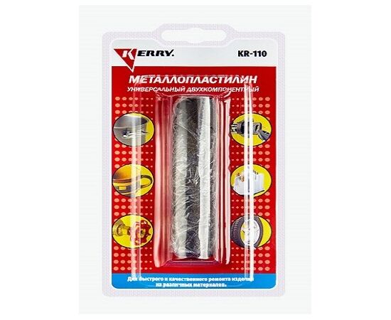 Представляет собой двухкомпонентную полимерную композицию повышенной вязкости для быстрого, прочного и герметичного склеивания изделий из металла, стекла, керамики, дерева и большинства пластиков. Устойчив к воздействию воды, антифриза и бензина.  Легкость в применении позволяет использовать универсальный металлопластилин KERRY® KR-110 для надежного ремонта:  узлов автомобиля (водяного насоса, поддона картера, течи бензобака и радиатора, незначительных дефектов кузова); элементов крепежа (восстановление сорванной резьбы и отверстий для шпилек, болтов и др.); фрагментов деталей (заделка сколов, раковин, трещин и др.); сантехники, мебели и игрушек; пластиковых труб и корпусов лодок.
