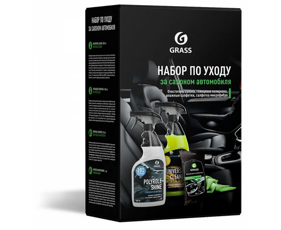 Глянцевый полироль для кожи, резины и пластика "Polyrole Shine" (флакон 600 мл) - профессиональный полироль для обработки приборных панелей, неокрашенных бамперов, покрышек, для очисткии полировки изделий из пластика, кожи, дерева, винила, и резины. Сохраняет первоначальный цвет, не оставляет жирных пятен, препятствует оседанию пыли, придает глянцевый блеск. Средство обладает приятным ароматом. Очиститель салона "Universal сleaner" (флакон 600 мл) - профессиональный состав для очистки салона автомобиля от любых загрязнений. Идеально подходит для всех видов тканей, искусственной кожи и пластика. Влажные салфетки из мягкого нетканого материала предназначены для очистки и защиты панели приборов и других пластиковых деталей интерьера автомобиля. Не оставляют разводов, обладают продолжительным антистатическим эффектом (упаковка 30 штук). Салфетка из микрофибры 1 штука, размер 30 х 30 см.
