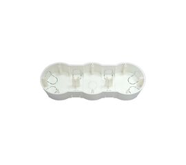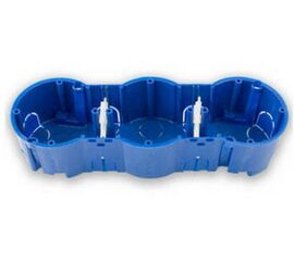 Коробка установочная, подрозетник КЕ 502 трёхместная  предназначена  для монтажа в сплошные стены и потолки из несгораемых материалов после монтажа здания с помощью песчано-цементной смеси и установки выключателей и (или) розеток для скрытой установки (при использовании внутри помещений)