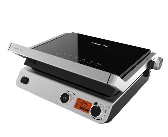 Таймер;Дисплей;Съемный лоток для жира;Индикация заданной температуры;Форма для гриля;Регулировка температуры;Регулировка степени поджаривания;Регулировка положения рабочей поверхности;Съемные панели;Антипригарное покрытие
