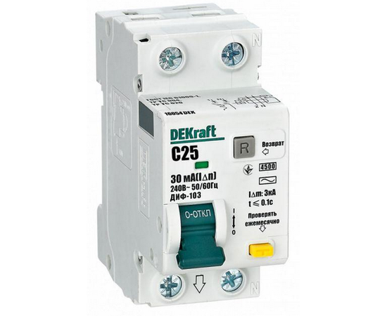 Выключатель автомат.дифференц. тока 2п (1P+N) C 25A 30мА тип АС 4.5кА ДИФ-103 DEKraft 16054DEK
