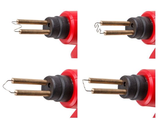 В комплект поставки входит 4 вида скоб по 50 шт. В 2 сопла, которые выходят из корпуса, вставляется металлическая скоба, под воздействием температуры она нагревается и помещается в трещину, образовавшуюся в пластике, с целью её устранения.