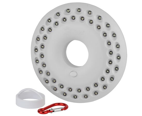 Светодиодный кемпинговый фонарь в футуристичном дизайне, специально разработанном компанией ЭРА. Фонарь предназначен для активного отдыха, отдыха на природе, для пикников, дачи. Дизайн фонаря функционален. 48 мощных светодиодов расположены по кругу таким образом, чтобы освещать максимально большую площадь ярким белым. Светодиоды энергоэкономичны, не перегорают и не требуют замены. Посередине фонаря предусмотрено отверстие, если надеть фонарь на любую подставку, например, на бутылку, получится настольный светильник. Фонарь оснащён мощным магнитом, так что его легко приклеить к металлической поверхности. Корпус выполнен из ударопрочного пластика и защищает от царапин и механических повреждений, а светодиоды встроены внутрь корпуса, что обеспечивает им дополнительную защиту. Дальность луча фонаря составляет 21 метр, мощность — 3,3Вт. Фонарь питается от двух батареек АА. Это позволило сделать фонарь портативным и лёгким, но в тоже время надёжным. Фонарь комплектуется кронштейном для подвешивания. Фонарь можно использовать не только в походах, но и в любых ситуациях, когда необходим яркий дополнительный источник света.