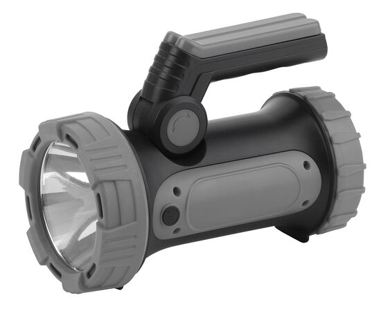 Мощный аккумуляторный фонарь-прожектор с боковым светильником и удобными складными ножками.