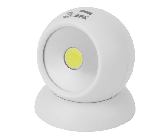 ЭРА SB-801 Сфера-1 - компактный светодиодный фонарь-подсветка на магнитном основании. Позволяет выбирать нужное направление света, вращая устройство под любым углом. Фонарь легко взять с собой и вновь разместить на стационарном магнитном основании. Удобная мобильная подсветка шкафов, рабочих поверхностей кухни, подсобок. Преображает быт, делая его более комфортным. Быстро крепится на самоклеящуюся основу. Для максимально надежной фиксации есть ушко на саморез или гвоздь. Работает от 3 мизинчиковых батареек. Для замены батареек не нужно отклеивать фонарь. База остается на месте, а отсек для элементов питания размещен в съемной части со светодиодами. От одного комплекта батареек непрерывно светит в течение 72 часов. Наличие светоотражателя обеспечивает широкий угол светового пучка. Фонарь освещает до 10 метров пространства. Светодиодная LED-плата COB (технология «мультикристалл на плате») создает сверхъяркий белый свет с высоким световым потоком (120 лм).