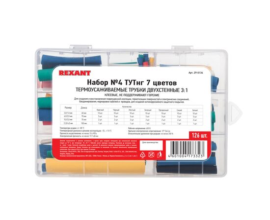 Набор № 4 состоит из термоусаживаемых трубок, предназначенных для восстановления и создания изоляции, герметизации поверхностей и электрических соединений кабелей, бандажирования и маркировки проводов, а также для создания антикоррозийных защитных покрытий.В результате нагрева трубки меняют свой диаметр, сжимаются и принимают форму предмета или материала, на который совершается усадка.Изделия, входящие в состав набора, выполнены из экологически безопасных материалов, не содержащих галогенов.По всей длине внутренней стороны трубок нанесен клеевой слой. При нагреве клей расплавляется и заполняет пустоты, герметизирует и склеивает место стыка с объектом воздействия.Трубки не поддерживают горение: в отсутствие открытого огня затухают и не воспламеняются. Это обеспечивает дополнительную безопасность в случае возникновения пожара.Состав набора:3,0/1,0 мм – 40 мм (красный 10 шт.; черный 10 шт.; желтый 10 шт.; зеленый 10 шт.; прозрачный 10 шт.; синий 10 шт.; белый 10 шт.);6,0/2,0 мм – 70 мм (красный 5 шт.; черный 5 шт.; желтый 5 шт.; зеленый 5 шт.; прозрачный 5 шт.; синий 5 шт.; белый 5 шт.);9,0/3,0 мм – 70 мм (красный 2 шт.; черный 2 шт.; желтый 2 шт.; зеленый 2 шт.; прозрачный 2 шт.; синий 2 шт.; белый 2 шт.);12,0/4,0 мм – 100 мм (красный 1 шт.; черный 1 шт.; желтый 1 шт.; зеленый 1 шт.; прозрачный 1 шт.; синий 1 шт., белый 1 шт.).
