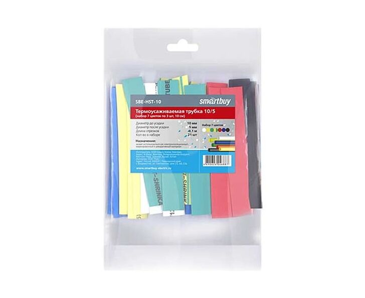 Набор термоусадочных трубок Smartbuy 10/5 мм (7 цветов по 3 шт 10 cм) представляет собой комплект из термоусадочных трубок диаметром 10 мм до усадки и 5 мм после усадки, длиной 10 см, в наборе 7 цветов по 3 штуки каждого цвета. Эти трубки предназначены для изоляции и антикоррозионной защиты электрических соединений, а также для обжатия и изоляции контактов в электрике. Они хорошо усаживаются от обычного бытового фена и широко применяются в домашних и профессиональных электромонтажных работах для защиты проводов и соединений. Набор удобен для цветовой маркировки благодаря разнообразию цветов трубок.