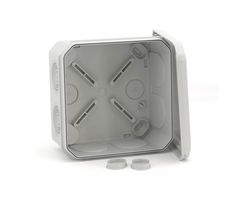 Коробка имеет 8 герметичных вводов по периметру для ввода жестких и гофрированных труб, а также кабелей с максимальным диаметром 25 мм, и 2 дополнительных ввода на торцевой части коробки для ввода жестких и гофрированных труб, а также кабелей диаметром 20 мм.