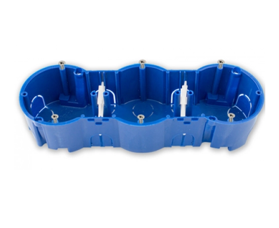 Коробка трехместная комплектуется саморезами предназначена для установки выключателей и розеток для скрытой установки, соответствие требованиям европейских стандартов, для бетона и кирпича. Степень защиты: не нормируется. Установочные размеры (размеры полости для замоноличивания), мм: 207х66х47,4. Габариты: 207x66x47 мм