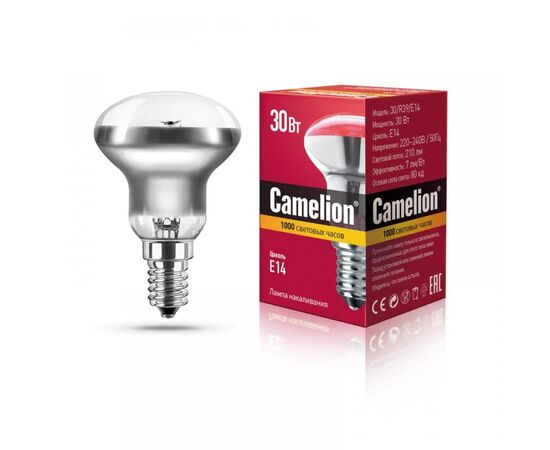 Зеркальная лампа CAMELION R39 E14 30Вт. Обычные лампочки накаливания продолжают оставаться популярным, востребованным источником света. Цветовая температура таких ламп комфортна для зрения, не приводит к усталости глаз и, как следствие, общему утомлению. Излучает непрерывный спектр, не мерцает. По этим причинам именно такие лампы рекомендованы для детских и школьных настольных светильников. Используются в бытовых осветительных приборах: светильниках, люстрах, бра. Лампы накаливания отлично работают при любом морозе и сильной жаре. Устанавливаются в морозильных камерах и духовках. ЛОН - лучшие лампы для бани и парилки в сочетании с влагозащищенными светильниками. Недостатки: высокий расход электроэнергии по сравнению со светодиодными лампами, сильный нагрев колбы.