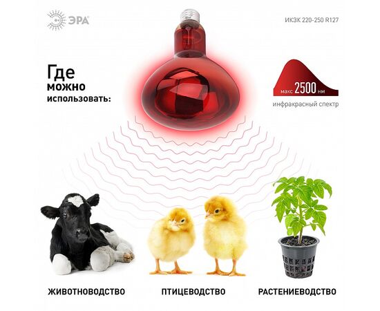Инфракрасная зеркальная лампа ИКЗК 220-250 R127 от ЭРА с красной колбой активно используется в животноводстве, птицеводстве и растениеводстве. Максимальная тепловая мощность без яркого света. Идеальна для стабилизации теплового баланса новорождённых и молодых животных. 100% энергии переходит в тепловую. Работа лампы не зависит от скачков сети, микроимпульсов. Не требуются стабилизаторы напряжения лампа работает даже при пониженном напряжении. Мгновенно включается и нагревается. Минимум пульсаций освещения. Компактные размеры.