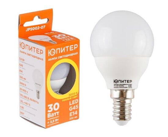 Лампа светодиодная G45 ШАР 6 Вт 170-240В E14 4000К ЮПИТЕР (JP5082-14) имеет шарообразную форму, излучает естественный белый свет и является аналогом лампы накаливания мощностью 50 Вт. Лампа оснащена узким цоколем Е14 (так называемый «миньон») и подходит для многих современных бытовых светильников. Обладает целым рядом преимуществ по сравнению с обычными лампами накаливания: энергопотребление значительно ниже, срок службы до 50000 часов.