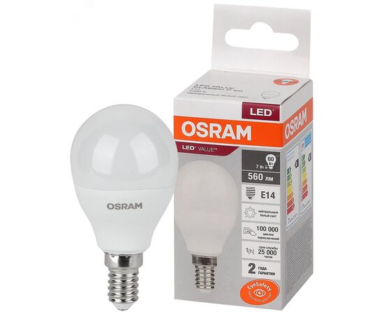 Лампа светодиодная OSRAM LED Value Р, 560лм, 7Вт, 4000К цоколь E14 предназначена для использования в стандартных электрических сетях. Не создает электромагнитных помех другим устройствам, соответствует всем стандартам по энергобезопасности. Алюминиевый радиатор в пластиковом кожухе обеспечивает низкую температуру нагрева за счёт отвода тепла от основных частей лампы.