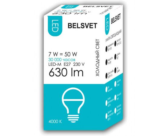Светодиодная лампа для освещения помещений. Световой поток 630Лм, холодный свет. Цоколь Е27. Класс энергетической эффективности А