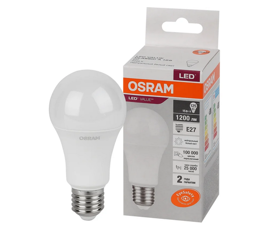 Светодиодная лампа OSRAM LED Value, A, E27, 1200Лм, 15Вт, замена 125Вт, 4000К, нейтральный белый свет.