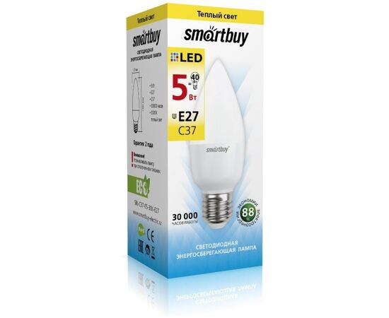 Светодиодная лампа Smartbuy C37. Мощность 5 Вт, цветовая температура 3000К. Энергосберегающая лампа общего бытового освещения, подходит для замены стандартных ламп накаливания. Подключается в стандартный цоколь Е27, имеет форму свечи. Колба лампы выполнена из пластика, с белым матовым покрытием изнутри. Лампы 5w могут быть использованы для декоративного освещения. Использование светодиодных ламп — оптимизация расходов на электроэнергию. Лампы LED имеют более длительный срок эксплуатации, в отличие от ламп накаливания.