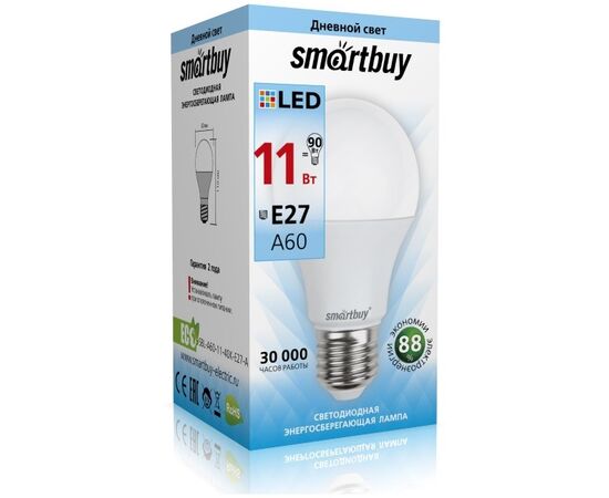 Светодиодная лампа Smartbuy A60 — энергосберегающая лампа общего освещения, подходит для замены стандартных ламп накаливания и галогенных. Благодаря своей экономичности, длительному сроку службы и экологичности светодиодные лампы выгодно отличаются от своих предшественников. Колба лампы матовая, грушевидной формы. Идеально подходит к любому светильнику, в котором используются данные типы ламп. В светодиодных лампах серии A60 применяются высокоэффективные светодиоды, обеспечивающие эффективность до 80 лм/Вт. При этом коэффициент цветопередачи ламп обеспечивается на уровне Ra>80. Ассортимент светодиодных ламп серии A60 представлен цветовыми температурами излучаемого света 3000 K, 4000 К и 6000К.