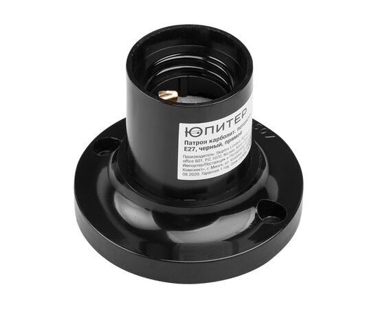 Патрон для лампочки Е27 карболитовый потолочный прямой ЮПИТЕР черный изготовлен из материалов, не поддерживающих горение. Предназначен для установки различных видов ламп: накаливания, светодиодных энергосберегающих, натриевых, ртутных, галогенных и др.