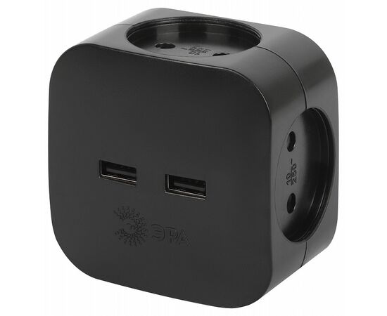 Тройник SP-4-USB-B Разветвитель электрический ЭРА на 4 розетки + 2хUSB 2400mA, без заземл 10А черный
