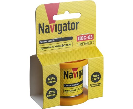 Припой Navigator ПОС-63 с флюсом предназначен для пайки и лужения радио- и электроаппаратуры, печатных схем. Он подходит для работы с компонентами, чувствительными к перегреву, так как обладает низкой температурой плавления. Сплав содержит малое количество вредных примесей.