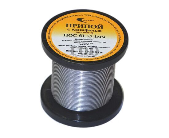 Припой оловянно-свинцовый. Содержание олова: 61% от общей массы. С канифолью. Для пайки и лужения токоведущих частей из меди, латуни и бронзы с герметичным швом.