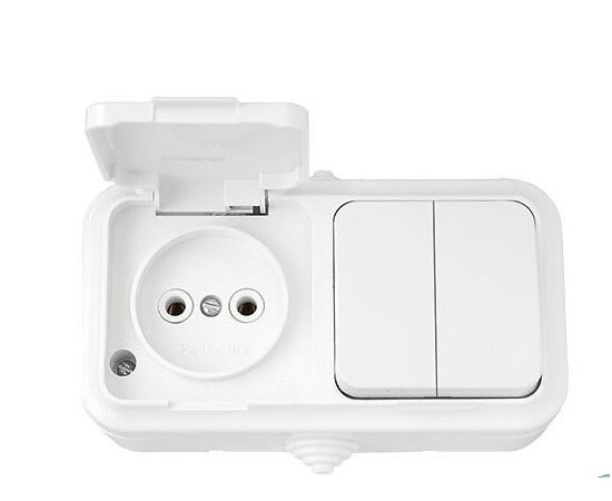 Блок выкл. 2 клав. + розетка (открытая, с/з, брызг. защ.) белая, Пралеска Аква, Bylectrica
