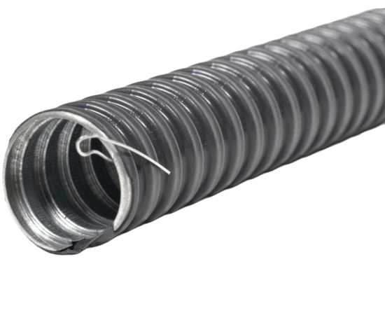 Металлорукав в ПВХ изоляции черный с протяжкой - негерметичный металлорукав в ПВХ изоляции, изготовленный из металлической горячеоцинкованной стальной ленты, предназначен для механической защиты электрических или информационных кабелей в трубных системах прокладки кабеля повышенной гибкости.