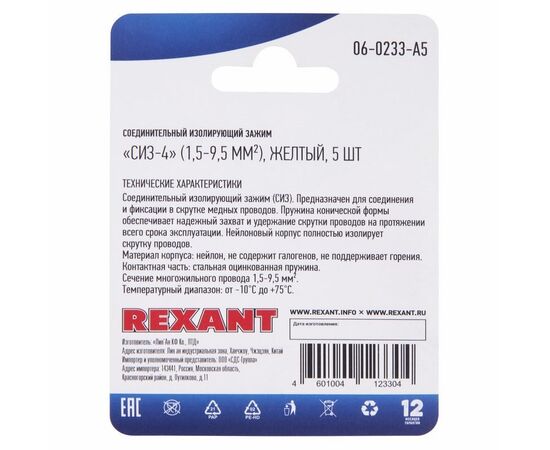 Соединительный изолирующий зажим REXANT СИЗ-4 предназначен для фиксации медных проводов в скрутке. Он выполнен из нейлона 6.6, который не поддерживает горение и не содержит галогенов. Корпус зажима желтого цвета. Внутри него находится стальная оцинкованная пружина, которая обеспечивает надежный захват и удержание проводов.