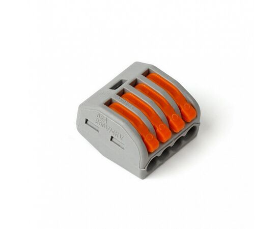 Клемма строительно-монтажная представляет собой надежное и удобное решение для соединения проводников. Она оснащена четырьмя отверстиями и предназначена для работы с проводниками сечением 0.5-4 мм². Эта клемма идеально подходит для различных электромонтажных проектов.