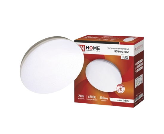 Светильник светодиодный серии DECO НОЧНОЕ НЕБО от IN Home - это отличное решение для равномерного освещения. Благодаря высокому индексу цветопередачи, свет максимально приближен к естественному. Работает от номинального напряжения 220 В и имеет мощность 24 Вт. Корпус выполнен из металла, степень защиты IP - IP40. Гарантия - 2 года.