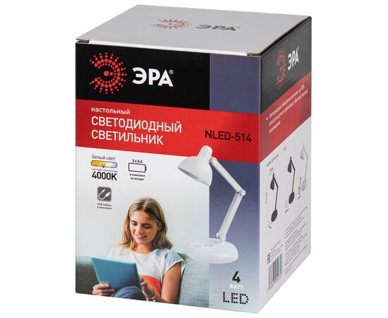 Настольный светильник NLED-514-4W-W со светодиодами (LED) в качестве источников света. Работает от элементов 3 х АА (не входят в комплект поставки) или от USB.