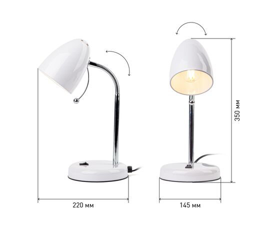 - Функциональные преимущества: Трендовые цвета. Металлический корпус. Выключатель на основании. Компактные размеры для удобного размещения на столе. Устойчивая конструкция. Удобная регулировка направления света.