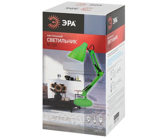 Настольный светильник ЭРА N-123-E27-40W-GR трендового дизайна с классической конструкцией может использоваться с разными источниками света - лампой накаливания, компактной люминесцентной лампой (КЛЛ) или светодиодной (LED) лампой. Выключатель на проводе. Устойчивое основание. Высота плафона регулируется двухсекционной сгибающейся стойкой, направление света - поворотом и наклоном плафона в любом направлении.