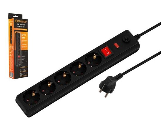 Сетевой фильтр ЮПИТЕР изготовлен только из качественных материалов в соответствии с ГОСТ60884-1 и рекомендуется для подключения дорогостоящего и чувствительного оборудования (компьютер, холодильник, телевизор, аудио- видео- техника, оргтехника и др.), у которого нет встроенной защиты. Встроенные элементы обеспечивают надежную защиту подключенных приборов от перенапряжения и импульсных помех. Термовыключатель отключает питание всех розеток от сети при превышении допустимой нагрузки. Выключатель имеет световую индикацию наличия напряжения в сети, а также позволяет одновременно отключить все подключенные приборы. Защитные шторки открываются нажатием только на две одновременно, что обеспечивает надежную защиту от случайного прикосновения к токоведущим частям (защита детей). Реальное сечение провода из чистой меди гарантирует работоспособность удлинителя при подключении нагрузки до 2200Вт. Латунная контактная группа для устойчивого электрического контакта между вилкой и розеткой. Присоединение проводов выполнено методом точечной сварки (в отличие от присоединения винтовыми зажимами), благодаря чему исключается возможность ослабления контактов в течение всего срока службы удлинителя.