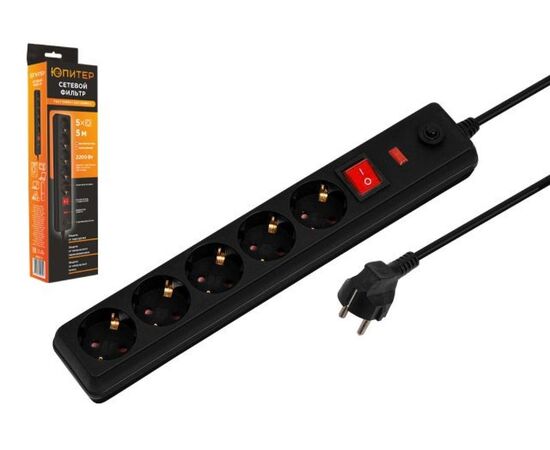 Фильтр сетевой 5м (5 роз., 2,2кВт, с/з, выкл, ПВС 3х0,75) черный, JP8501-12