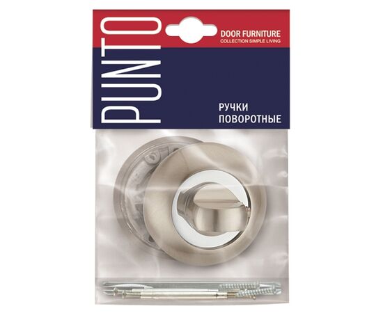 Поворотные ручки на круглом основании Punto BK6 серии TL из коллекции SIMPLE LIVING подходят для установки на внутренние входные и межкомнатные двери. Материал изготовления: ZAMAK (сплав цинка, алюминия, магния и меди). Гальваническое покрытие прошло тест на устойчивость к коррозии в соляном тумане. Цвет: матовый никель/хром. В комплект входят: соединительный квадрат 6x80 мм, винты, стяжные винты.