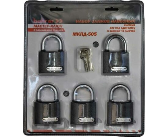 Набор замков BOHRER Мастер-Ключ МКПД-505 5 замков + 5 ключей 71010505 универсальный, подходит для запирания дверей жилых и подсобных помещений, дачных построек, кладовых, сараев. Замки оснащены дужкой из закаленной стали, что увеличивает сопротивление к перекусыванию, имеют усиленный корпус из стали, что обеспечивает дополнительную защиту имуществу. Система все под один ключ.