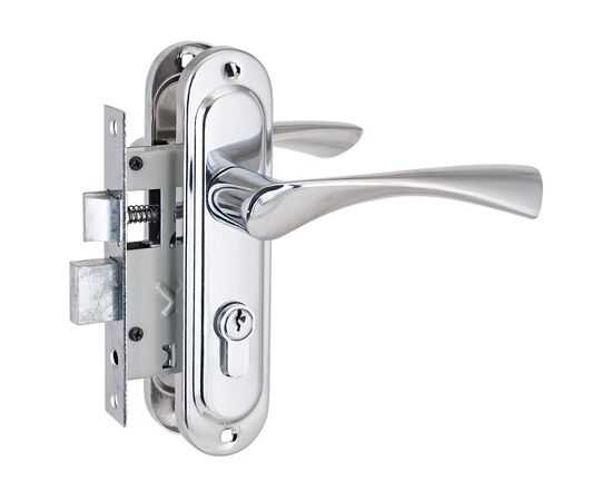Замок врезной с ручками. Предназначен для установки в деревянные двери толщиной до 40мм, правого и левого открывания. Дверь может быть закрыта на защелку и открыта с помощью фалевой ручки при открытом засове замка.