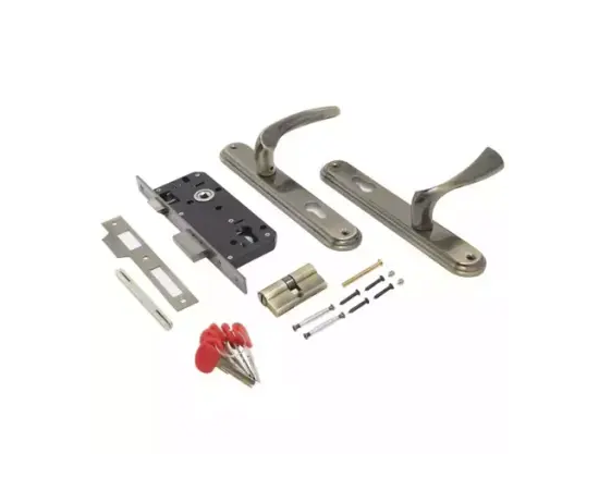 Комплектация:латунный цилиндровый механизм 62мм, 5 перфоключей, ответная планка, винтовые стяжки.