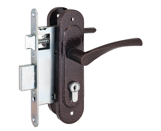 Замок врезной с ручками, цилиндровый. Предназначен для установки в деревянные двери толщиной 40-50мм, правого и левого открывания. Стальной оцинкованный корпус. Прямоугольный ригель из цинкового сплава, вылет 22мм. Межосевое расстояние 55мм. Удаление ключевого отверстия 55мм. Габаритный размер 85х130 мм. Ручки - сталь, алюминиевый сплав, покрытие - краска, крепление - стяжками. Комплектуется цилиндровым механизмом 70мм с 4 ключами. 15000 секретных комбинаций.