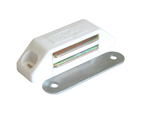 Магнитный фиксатор устанавливается на корпус мебели, а к внутренней стороне створки прикрепляется металлическая планка.