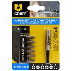 Набор бит для шуруповерта из 7 предметов GRAFF , включая адаптер (магнитный держатель). Набор профессиональных холоднокованных бит для шуруповерта в удобном пластиковом футляре. В набор входят 6 бит: PH 1x25 мм - 1 шт., PH 2x25 мм - 1 шт., PZ 1x25 мм - 1 шт., PZ 2x25 мм - 1 шт., SL 4,5x25...