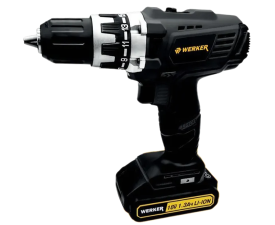 Аккумуляторная профессиональная дрель-шуруповерт WERKER EWCDL814 предназначена для работы с различными видами крепежа и просверливания отверстий. Развивает от 0-350/1200 оборотов в минуту. Для работы с материалами разной твердости предусмотрены 2 скорости. Модель оснащена подсветкой, что обеспечивает комфортную работу при плохом освещении. Эргономичная конструкция с прорезиненной рукояткой плотно и надежно лежит в руке. Патрон ПСБ-13 мм. Дрель-шуруповерт поставляется в чемодане с аккумулятором Li-Ion 1,3 Ач, с 6 битами, 6 сверлами по металлу 2/2,5/3/4/5/6 мм, магнитный держатель 6 гр.1/4 дюйма. Напряжение аккумулятора — 18 В. Максимальный крутящий момент — 38 Hм.