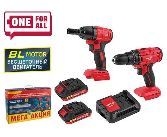 Набор включает в себя аккум. дрель-шуруповерт WORTEX LX BD 1820 Li; аккум. ударный гайковерт WORTEX CWR 0318; 2 аккумулятора WORTEX CBL 1820-1, 2 А*ч; зарядное устройство WORTEX FC 1515-1, 2 А.