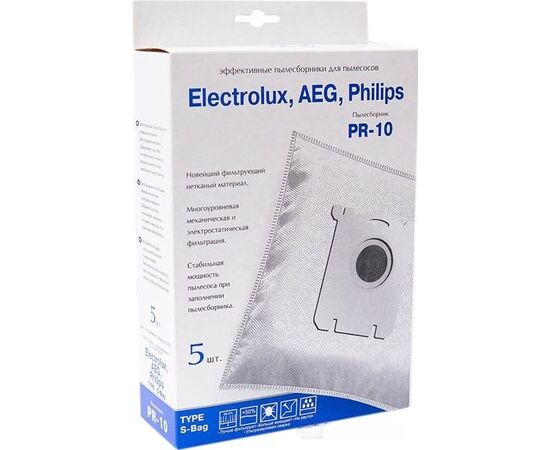 PR-10 это синтетические одноразовые пылесборники-мешки для пылесосов фирм PHILIPS, ELECTROLUX, AEG и др. TYPE S-Bag. В комплект входит 5 пылесборников.