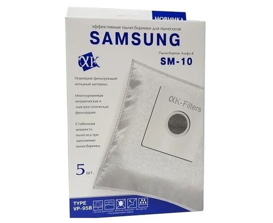 SM-10 это синтетические одноразовые пылесборники-мешки для пылесосов фирм SAMSUNG, DAEWOO, CLATRONIC и др. TYPE VP-95B. В комплект входит 5 пылесборников.
